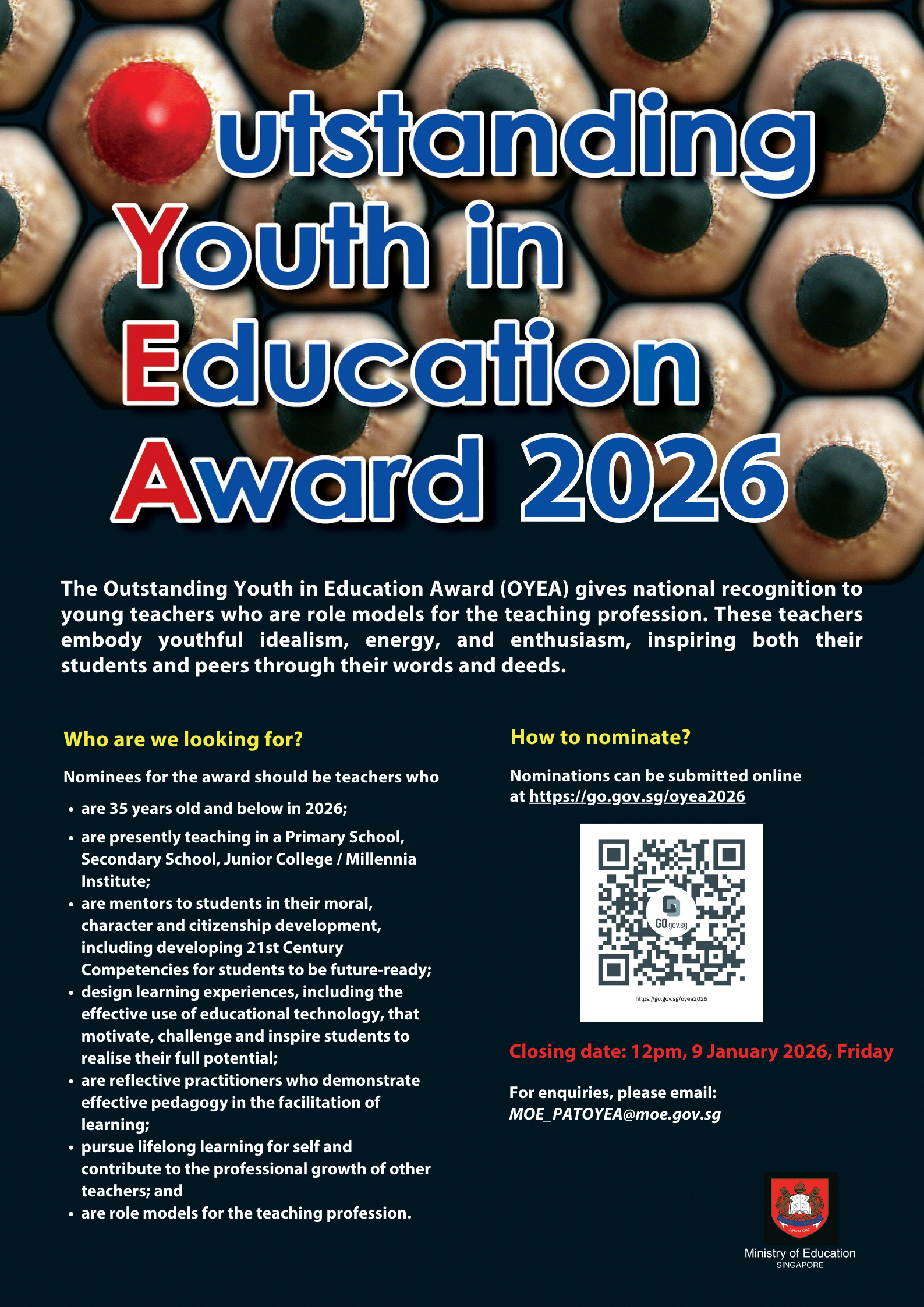 OYEA is open to teachers aged 35 years and below, and presently in service at a primary school, secondary school, junior college/Millennia Institute.